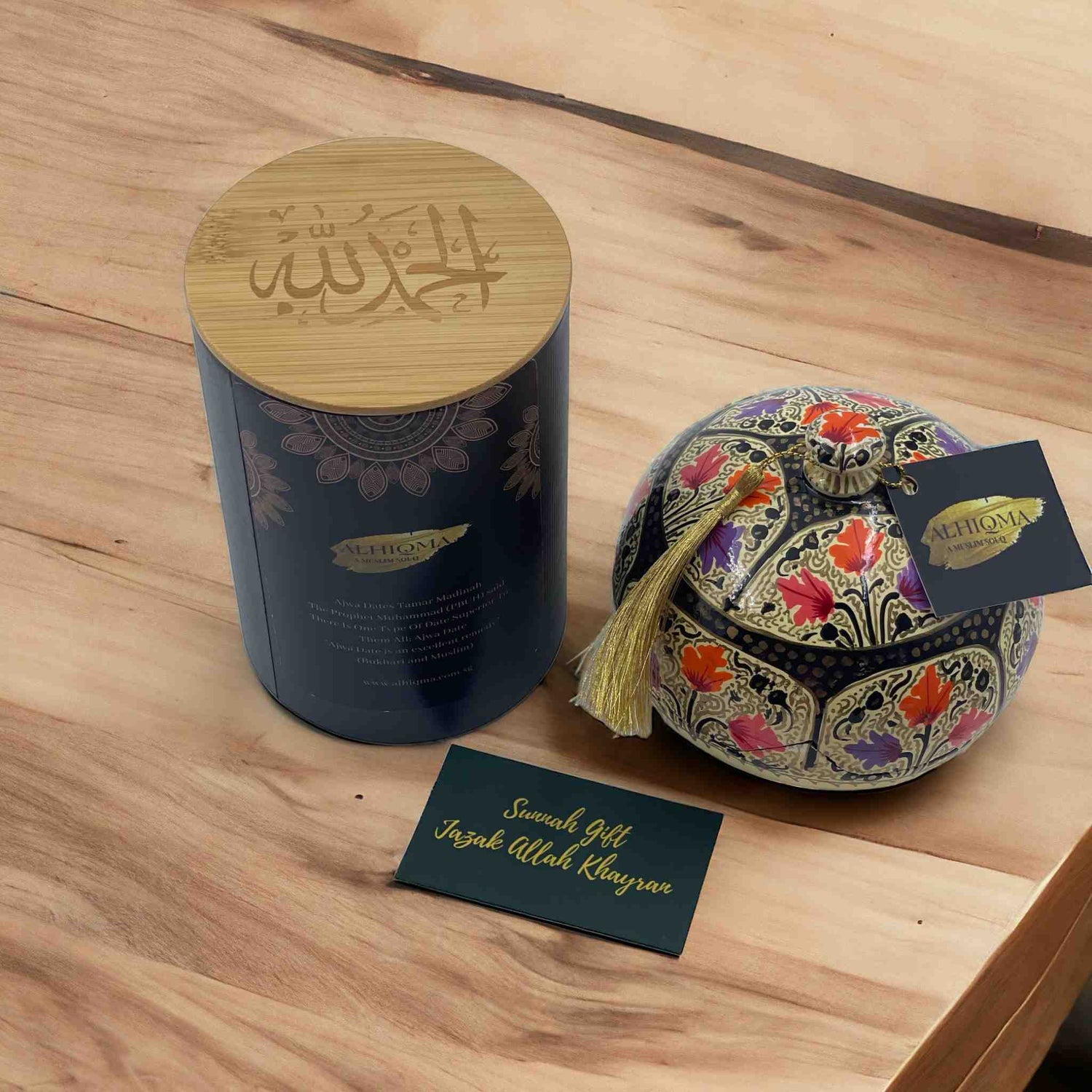 Indulge in the artistry of gratitude with our exquisite, handmade papier-mâché bonbonnière—a masterpiece crafted to elevate your special gesture. Brimming with our premium Ajwa Dates renowned for their rich flavor and historical significance, this gift transcends the ordinary. Meticulously created by skilled artisans, each bonbonnière is a unique blend of sophistication and tradition. Perfect for special occasions, it not only expresses appreciation but also shares a taste of exceptional quality.