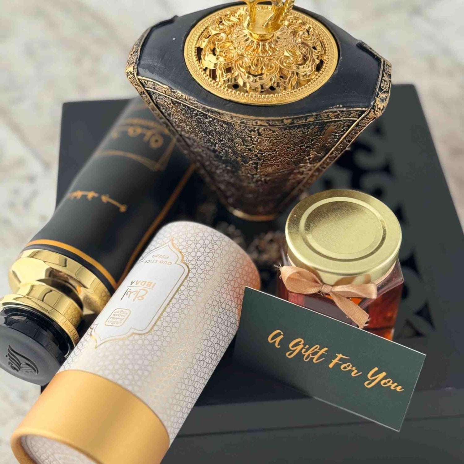 Indulge in the luxurious world of oud with this thoughtfully curated gift box, perfect for housewarmings or special occasions. The set includes: