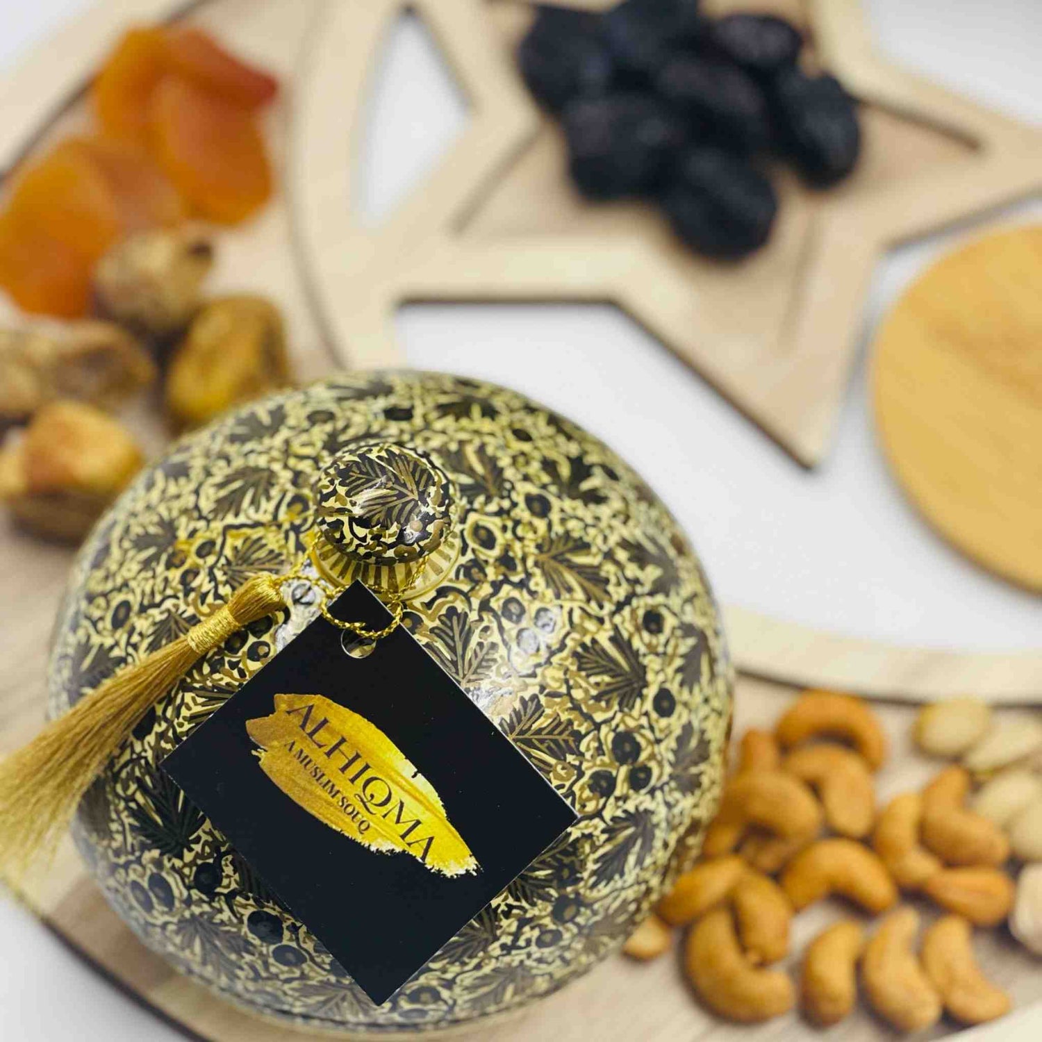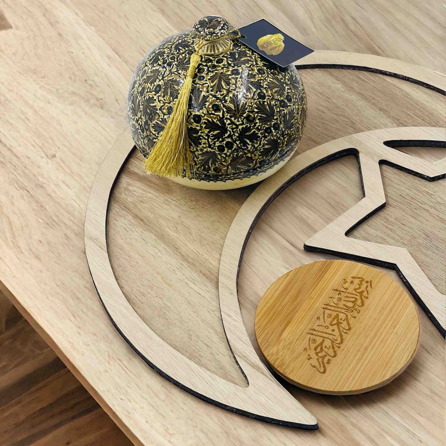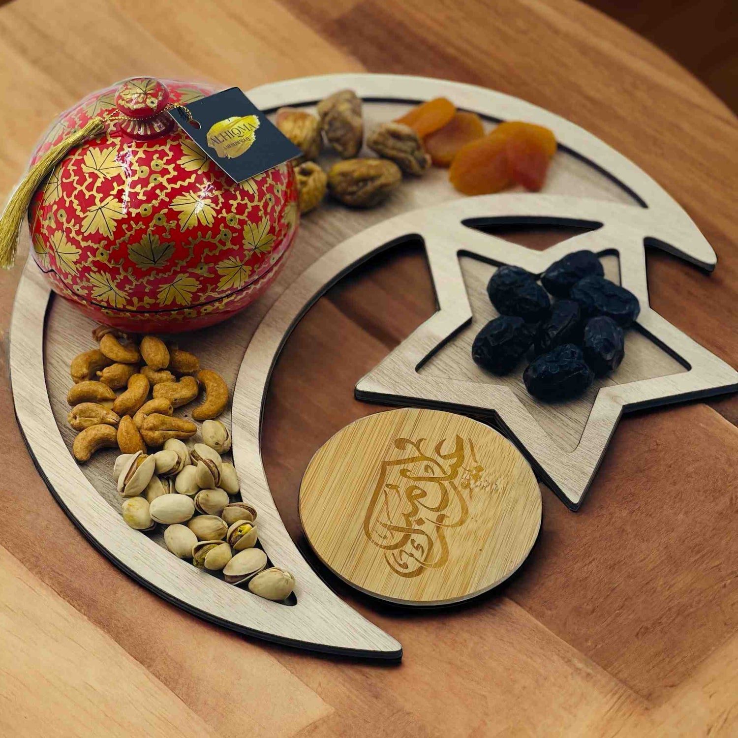- ensemble thoughtfully combines a moon and star platter crafted from high-quality wood, featuring a timeless and classic design tailored for presenting Ajwa dates. Additionally, the package includes a selection of Bonbonnieres with Tamar Madinah Ajwa 225g offering recipients the freedom to choose from a diverse range of options.
