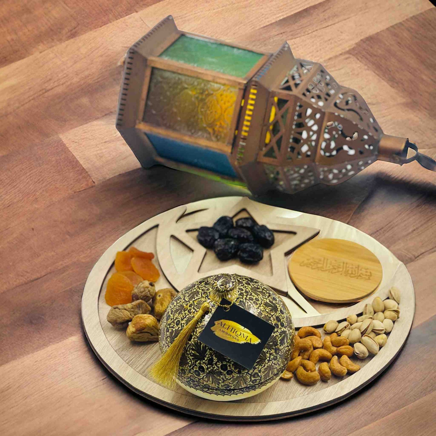 The tabletop snack tray, a part of this exquisite gift, is made from wood, and its dimensions measure 35cm x 31.2cm x 0.8cm (13.78 inches x 12.28 inches x 0.31 inches). The tray comes with an additional Complimentary Arabic calligraphy Lid, adding a distinctive touch to this elegant and meaningful gift.