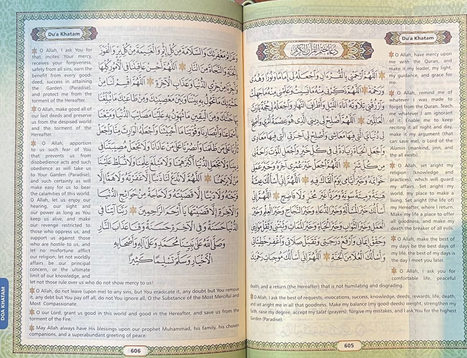 In Arabic, "Khatam Quran" (ختم القرآن) refers to the completion of reciting the entire Holy Quran from beginning to end. This is a significant spiritual milestone for Muslims, especially during the holy month of Ramadan.