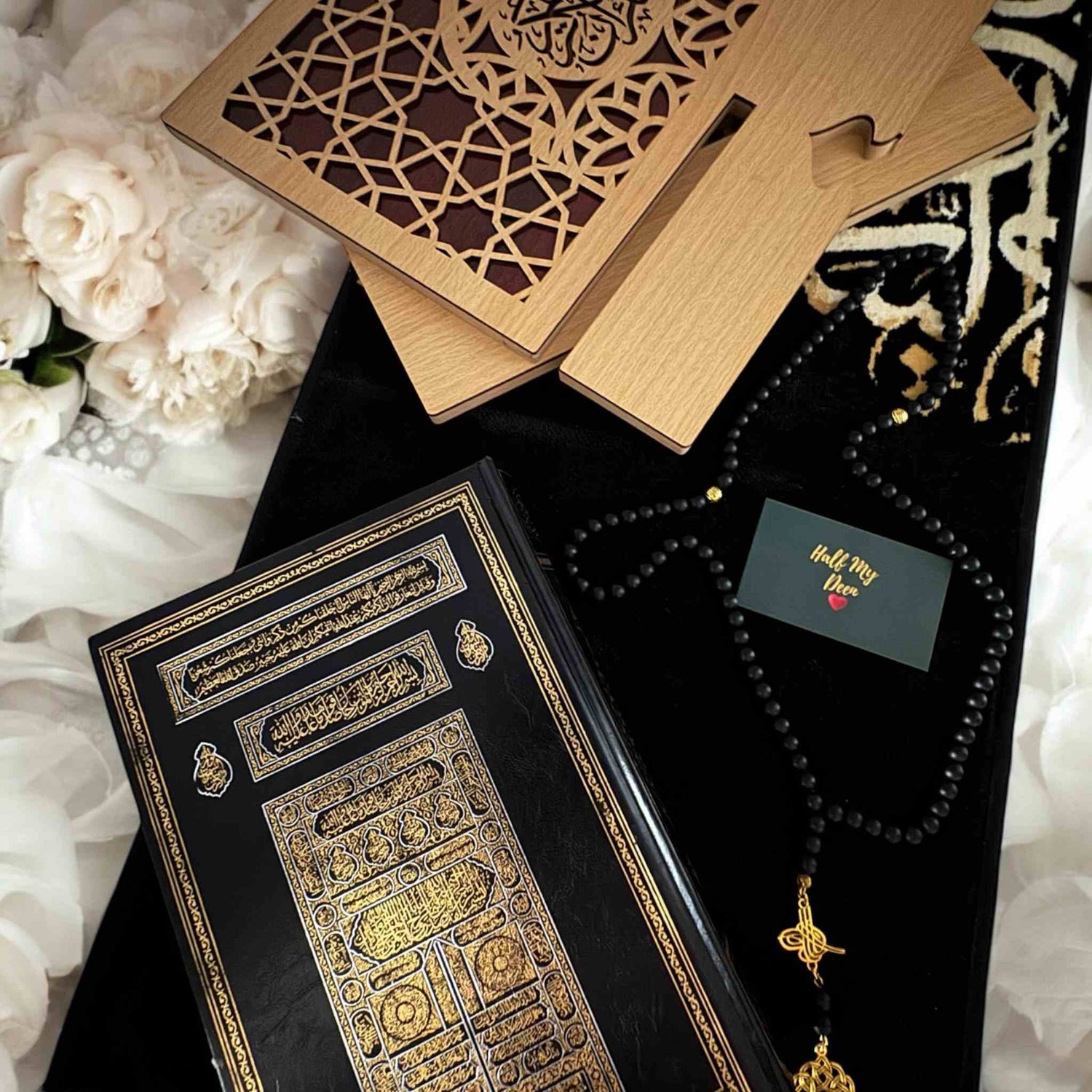 • Wooden Rehal (Quran Stand): Crafted from high-quality wood, this traditional Quran stand is both functional and stylish, designed to hold the Quran securely during recitation. Its timeless design reflects reverence and respect for the Holy Book, making it a meaningful addition to any spiritual space.