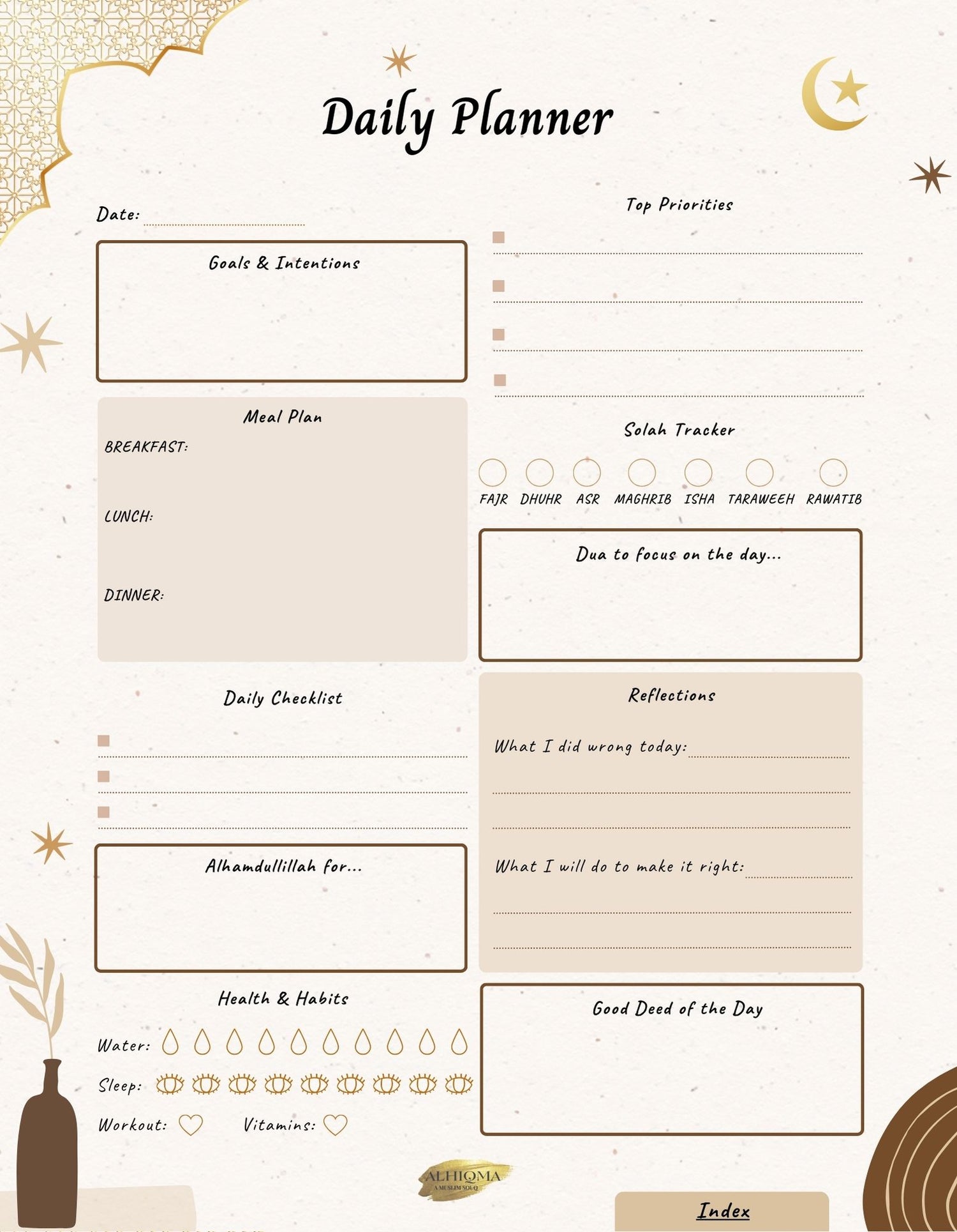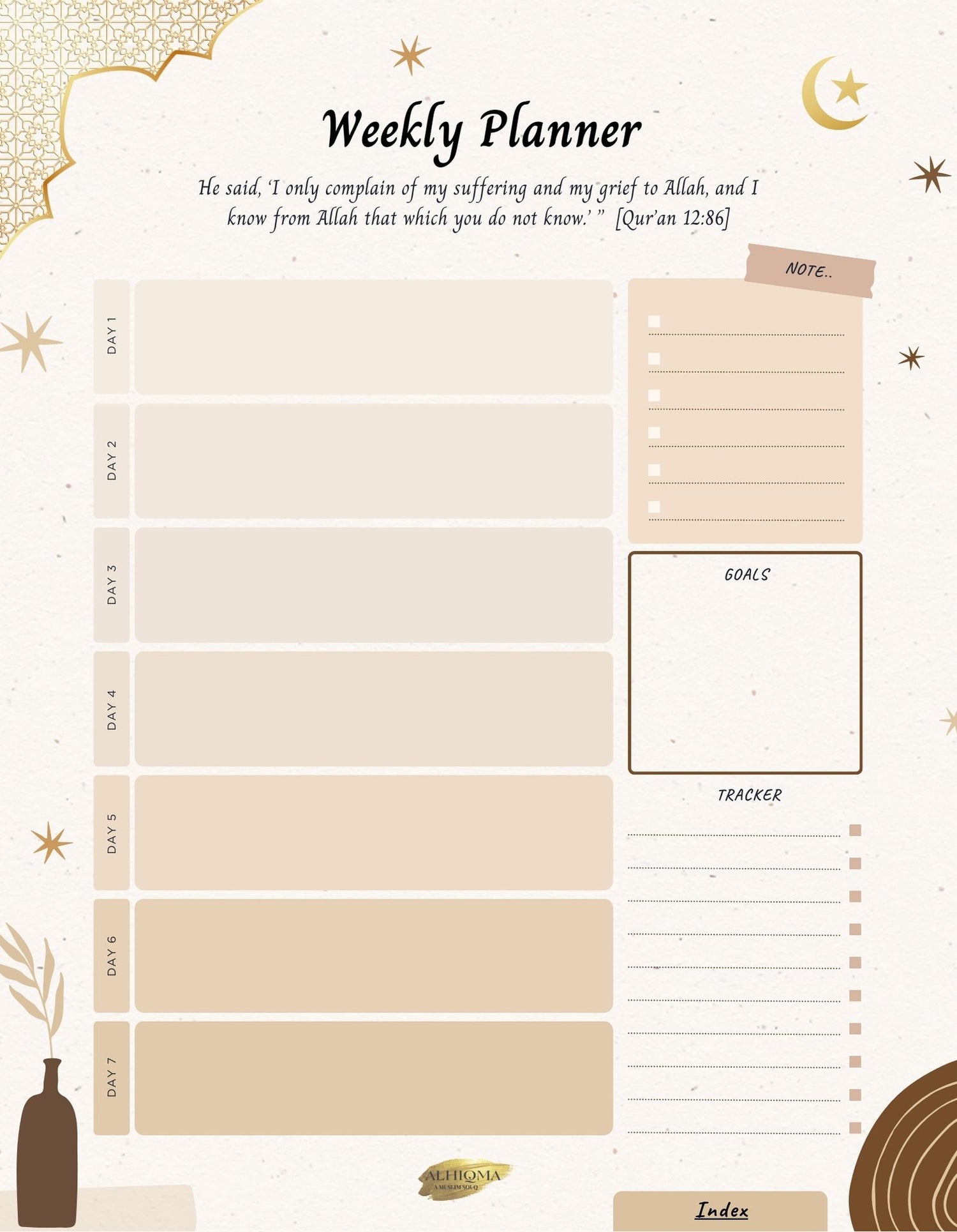 Achieve your goals, manage your finances, and stay spiritually grounded with AlHiqma's 2025 Islamic Planner. This thoughtfully designed digital planner combines practicality and faith, helping you stay productive while following the Sunnah.