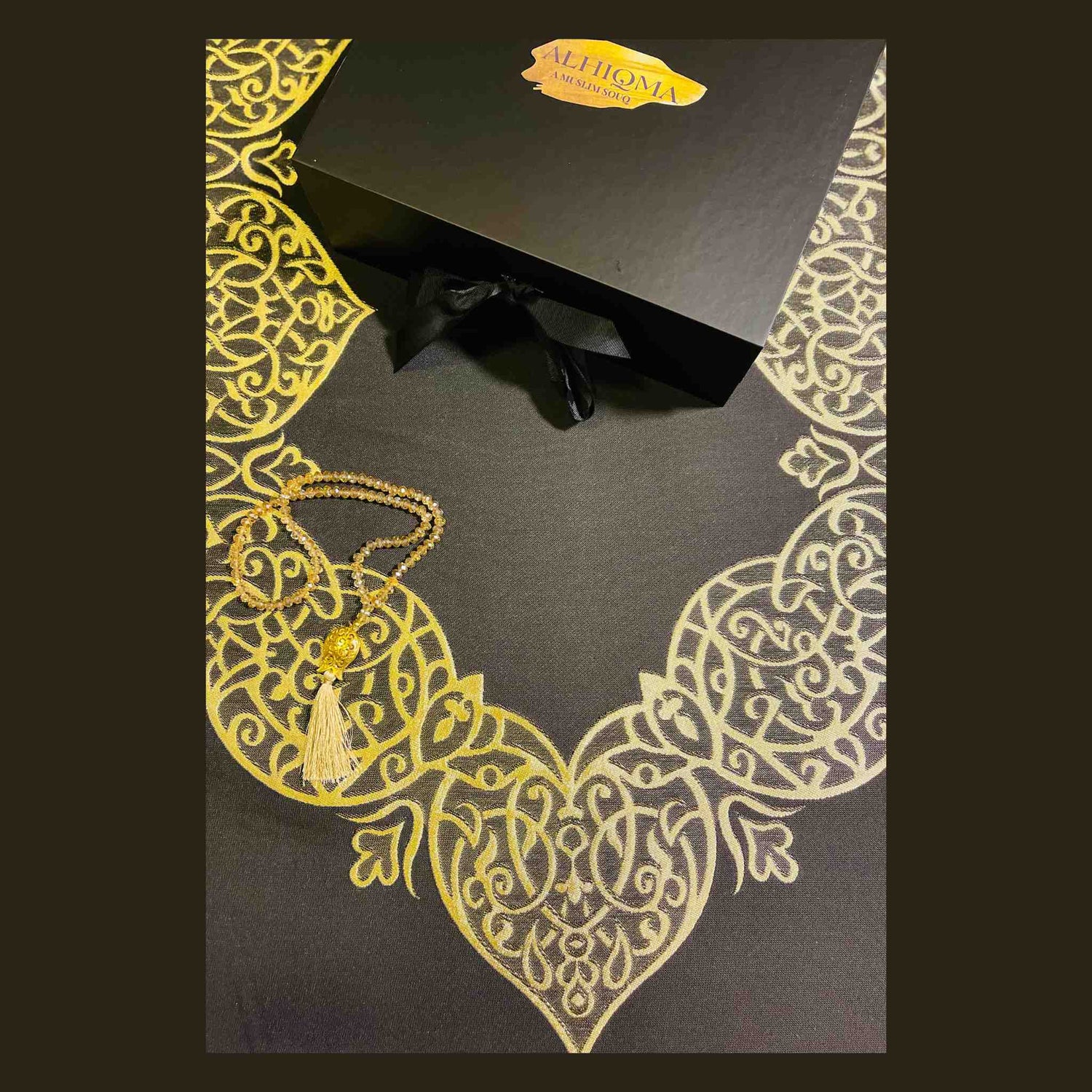 3. Gift Set Contents: The gift set includes a set of Luxury Prayer Mats, Crystal Prayer Beads presented in an elegant Organza Pouch, a Greeting Card, a White Magnetic Box, and a beautiful Ribbon.