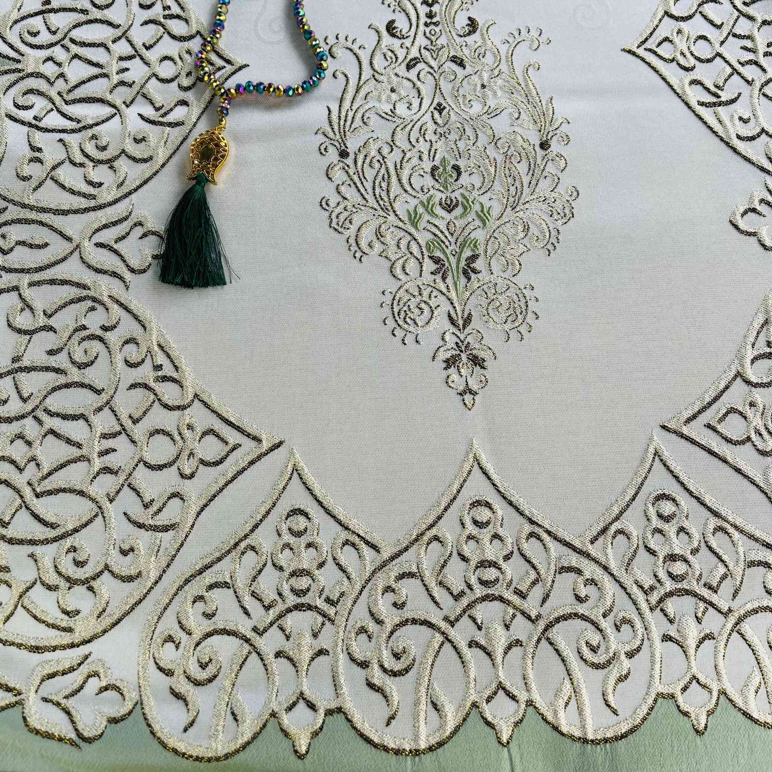 1. Exquisite Detailing: The prayer mat features intricate embroidery, delicate lace, or ornate patterns, enhancing its grandeur and beauty.