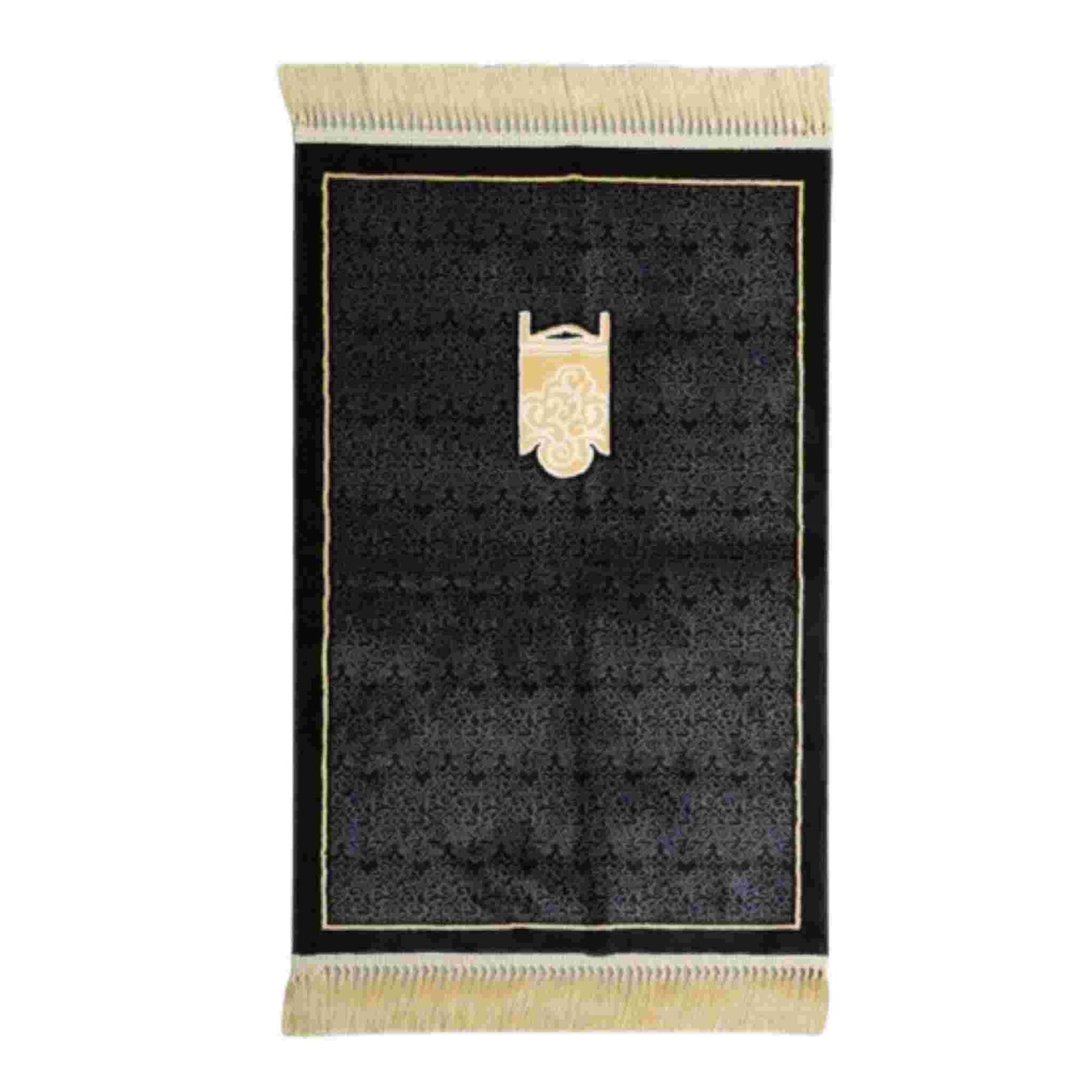 Experience the epitome of luxury and spirituality with our Mecca Luxurious Black Prayer Mat. The exquisite design seamlessly blends luxurious black tones with intricate gilded motifs, reflecting the magnificence of the Holy Kaaba.