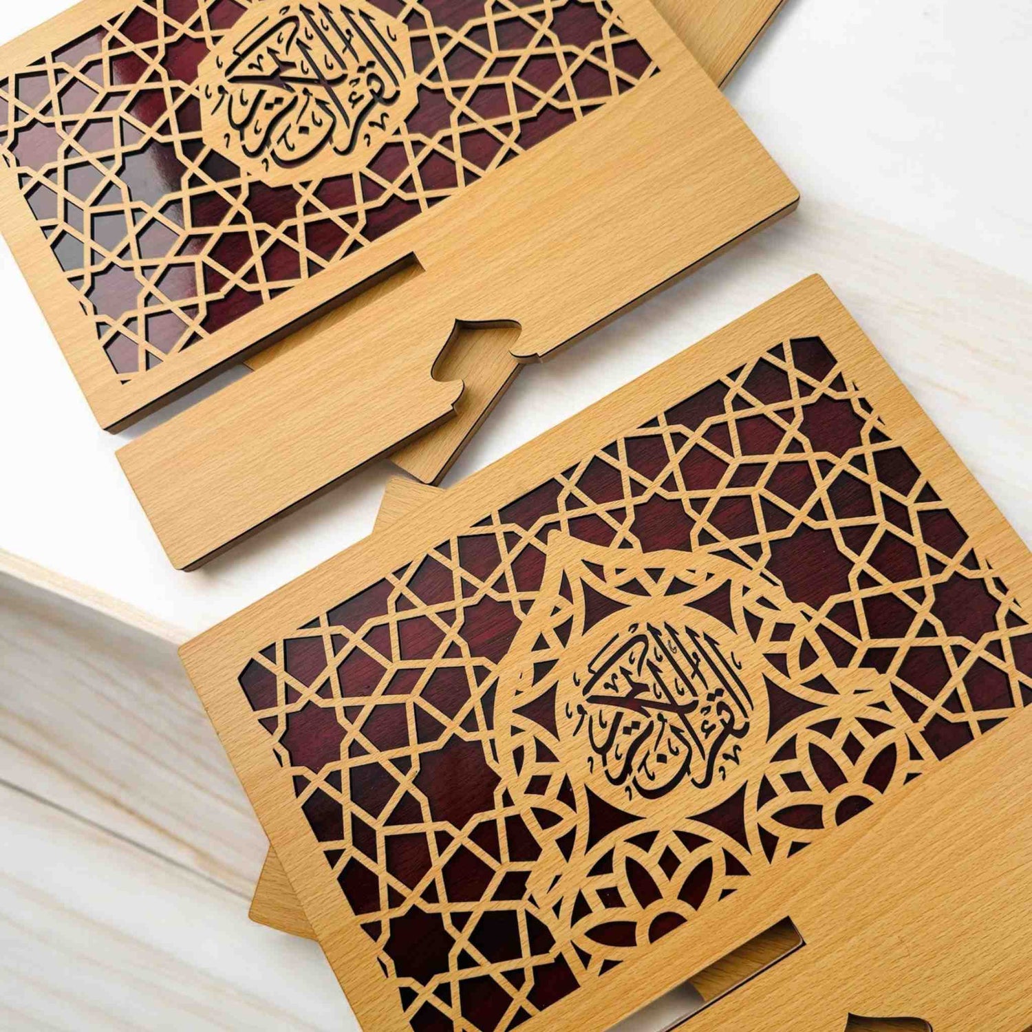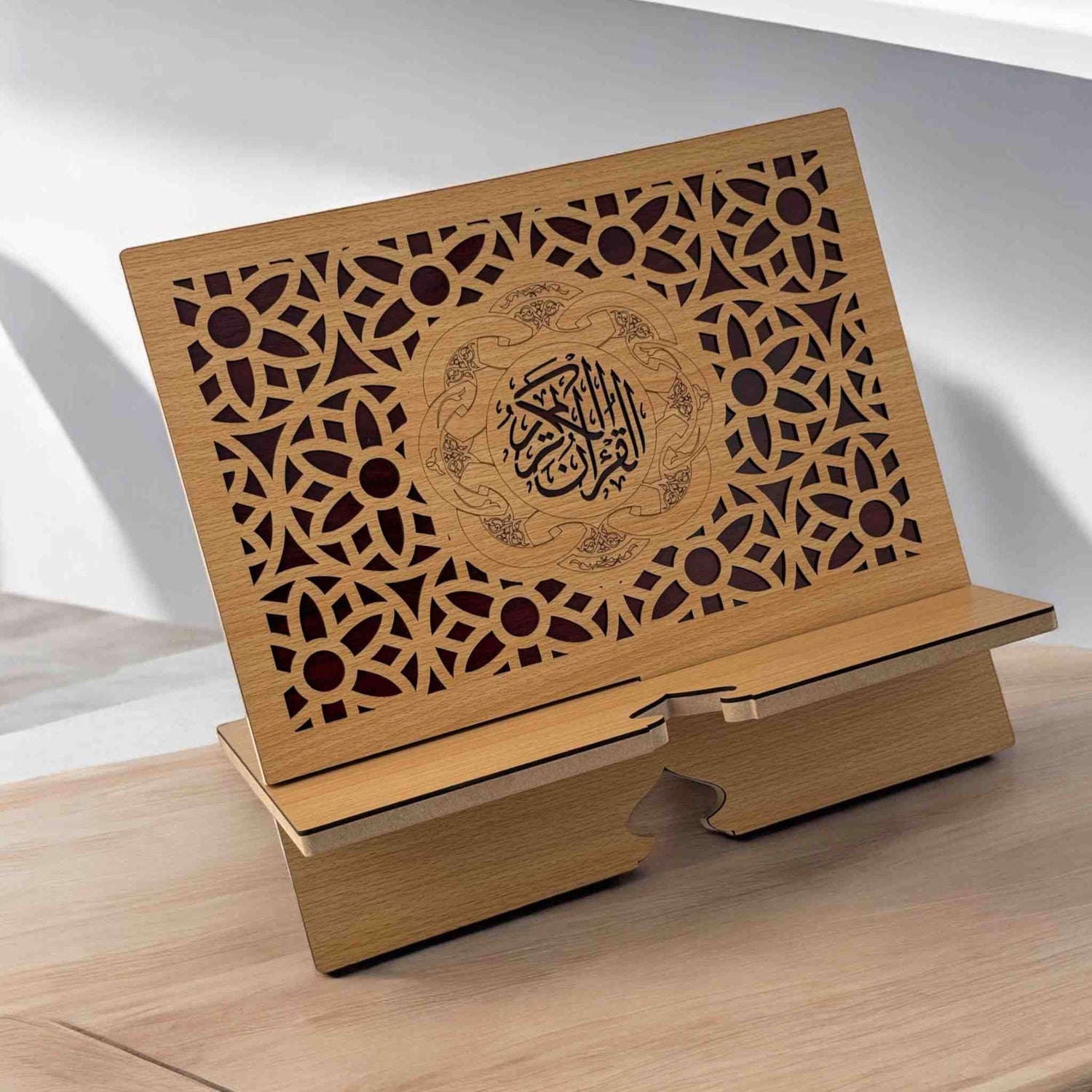 Calligraphy: The stand features the Arabic calligraphy of "Al Quran Al Karim" (The Noble Quran), highlighting the sacredness of the Quran.