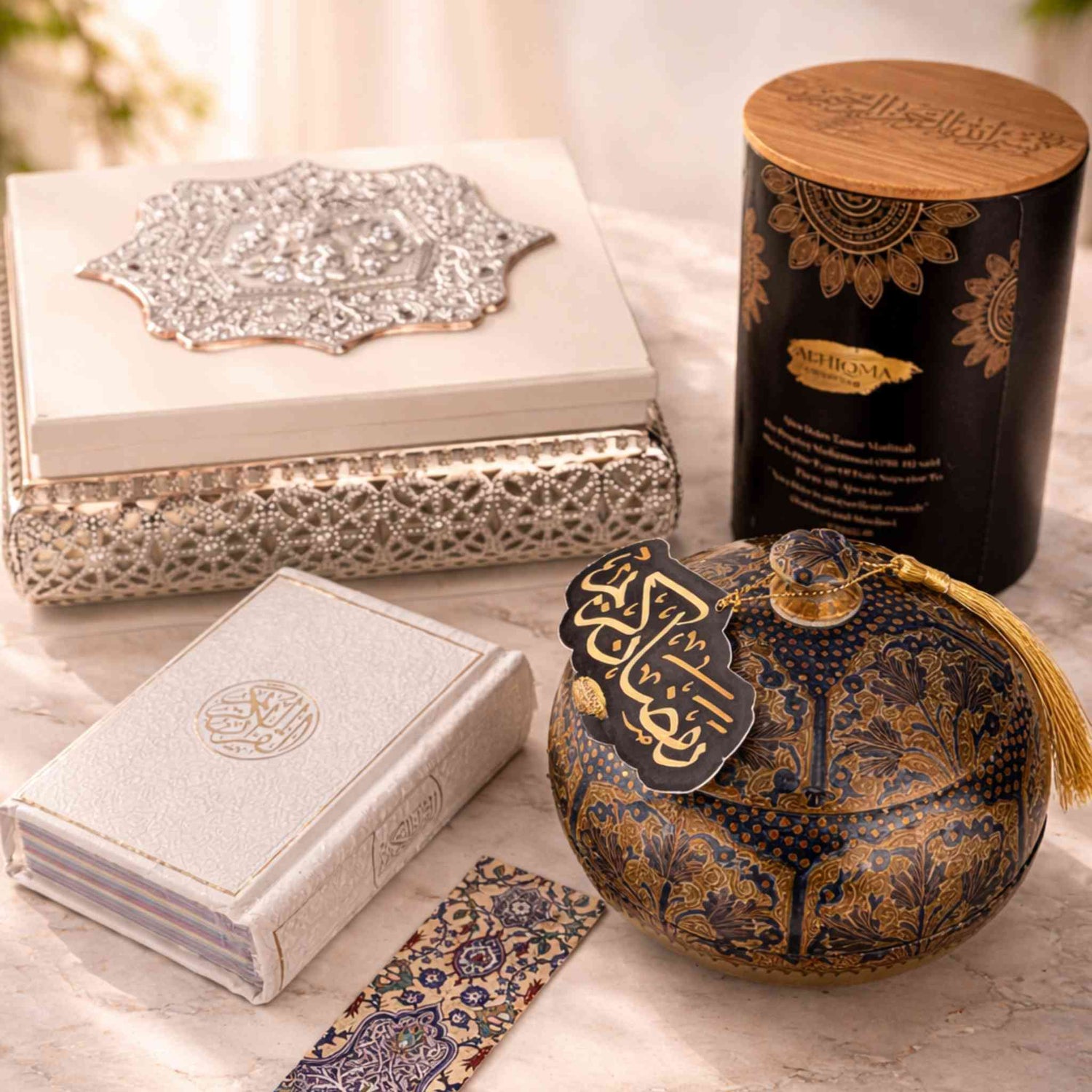 Presented in an elegant canister adorned with Arabic calligraphy