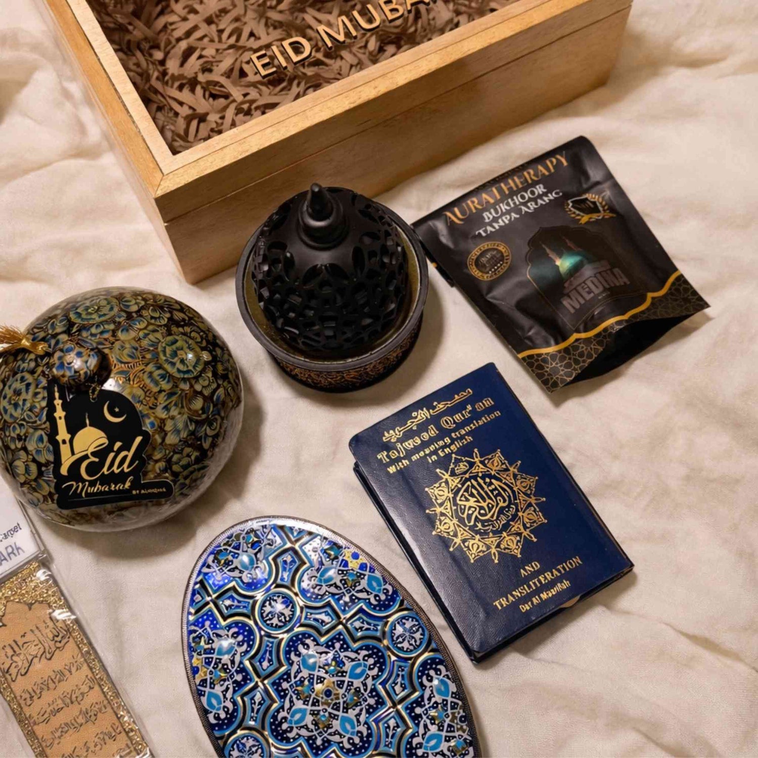 A refined Eid gift set thoughtfully curated with meaningful Islamic essentials and delightful festive treats.