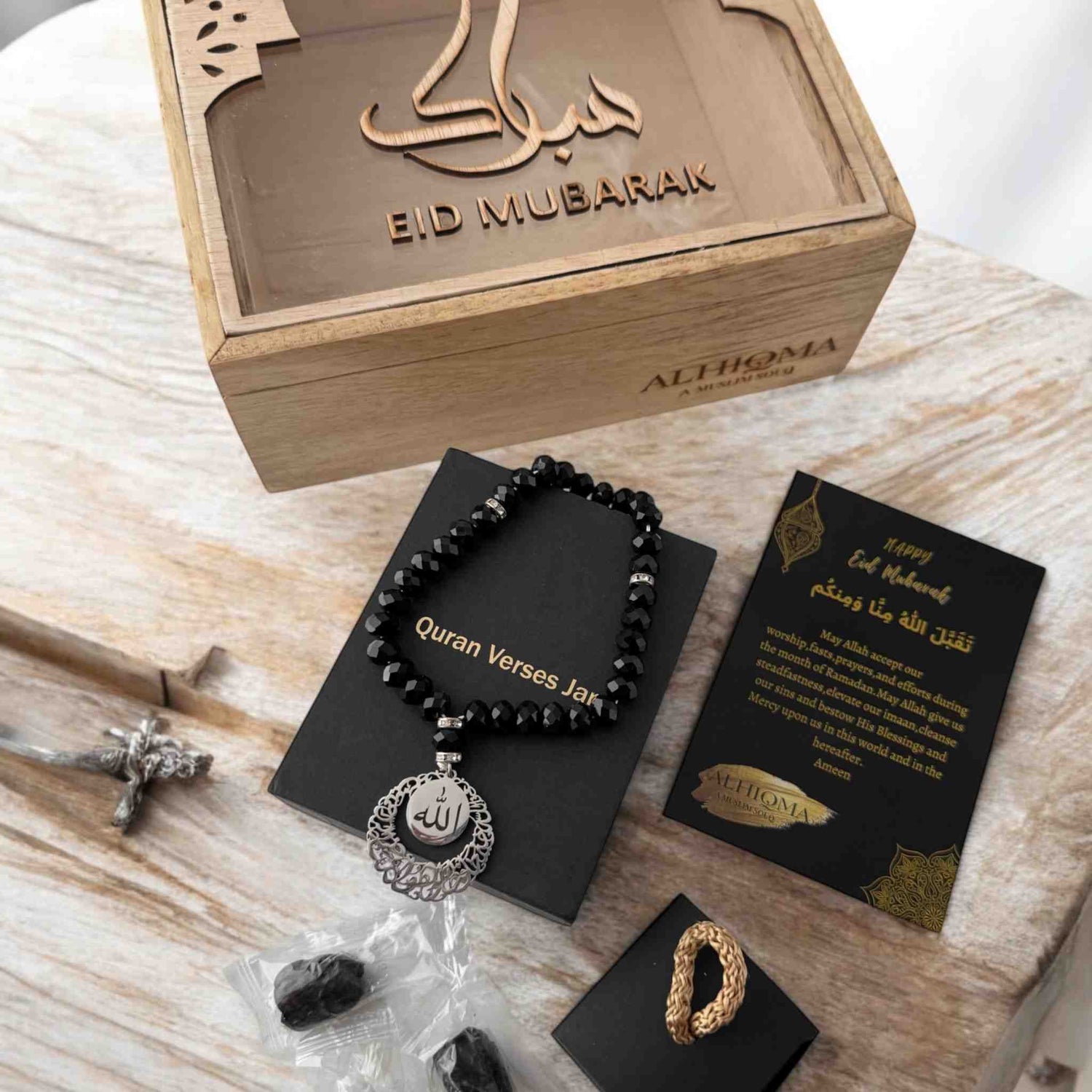 A beautifully curated gift set designed to enhance spirituality and celebration during Eid. Presented in an Eid Mubarak wooden box, this set includes:
