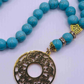 "Introducing our exclusive 33-prayer bead tasbih crafted with vibrant Turquoise gemstone known for its vibrant blue or greenish-blue color. It is often associated with calmness and spiritual grounding. Each bead meticulously chosen for its calming and spiritual properties. Engraved with Quran Surah Al Furqan on the Tassel,which is the 25th chapter of the Quran, and it emphasizes the criterion between right and wrong.this tasbih serves as a meaningful connection to the divine. The elegant tassels add a touch of sophistication, making this tasbih not just a tool for prayer but a beautiful accessory. Handcrafted with care, it's a reminder of serenity and spiritual strength."